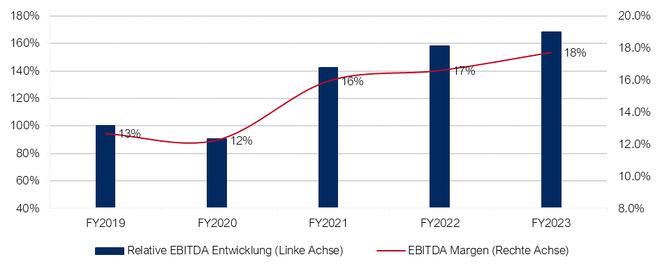 Der Ausblick ist gut, mit Anstieg der absoluten EBITDAs bis 2023 (+13% p.a.) begünstigt durch steigende Umsätze (10% p.a.) und verbesserter Profitabilität (EBITDA-Marge: 16-18%).