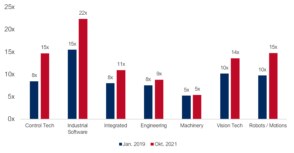 EBITDA-Multiplikatoren nach Sektoren: Januar 2019 & Oktober 2021 (Index 8,5x & 13,5x)