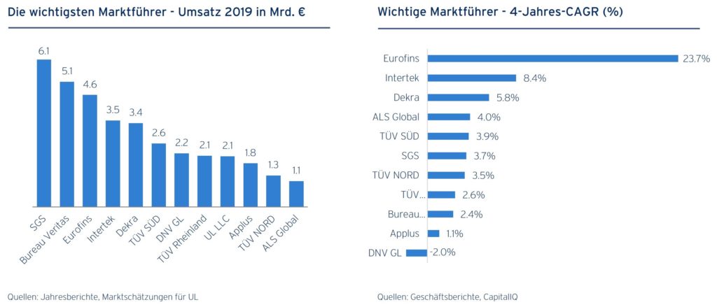 Der TIC-Markt wird von 12 Marktführern mit einem Umsatz von mehrere Milliarden Euro im GJ 2019 dominiert: 50% davon sind börsennotierte Unternehmen – SGS, Bureau Veritas, Eurofins, Intertek, Applus und ALS, während die anderen 50% gemeinnützige Organisationen sind.