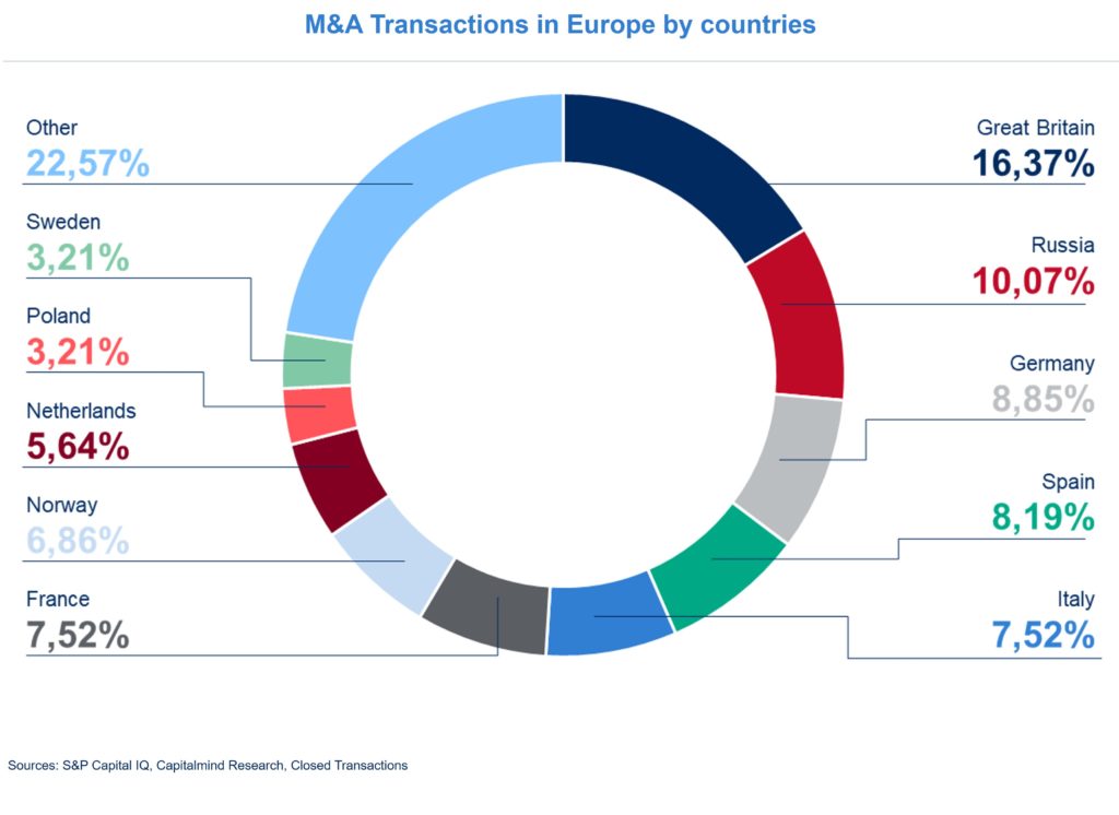 The UK again leads the list of transactions in Europe, followed by Russia. Together, these two countries account for just under 30% of the 900 deals, sorted by the location of the target company. As in the previous year, purchases of generation companies dominate. 87% of the buyers come from the region (Europe).