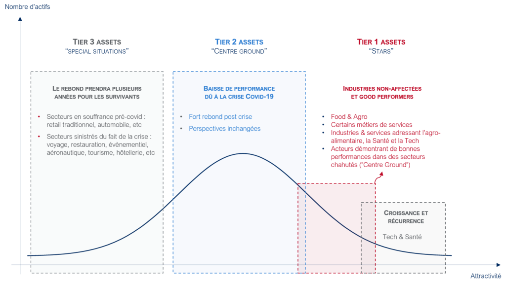 • Le « Centre Ground » est composé de l’essentiel des sociétés de services et d’industrie. Ces sociétés ont été affectées par la crise sanitaire, vont connaître une baisse de performance sur l’exercice en cours, mais n’encourent pas de problème de survie. Le soutien massif de l’état au travers des mécanismes de chômage partiel et l’injection de liquidités au travers des PGE permet à ces sociétés de surmonter la crise, et nombre d’entre elles mettent cette période à profit pour améliorer leur efficacité opérationnelle, accélérer leur digitalisation et ajuster leur organisation pour relancer la mécanique. Le marché du M&A pour ces acteurs est à l’arrêt pour trois raisons : tout d’abord car les marges de manoeuvres des acquéreurs industriels sont limitées, notamment du fait de bris de covenants bancaires ou parce qu’ils n’ont pas distribué de dividendes – il est donc plus difficile d’expliquer aux actionnaires qu’il faut dépenser de l’argent pour des acquisitions ; deuxièmement car les investisseurs financiers attendent le rebond et la confirmation de la reprise ; enfin, parce que les vendeurs se donnent du temps pour privilégier une meilleure valorisation dans 12 à 18 mois.