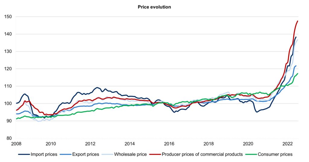 • The end of the line has probably not yet been reached: Inflation of producer prices, wholesale prices and import prices reached new highs in May 2022. For example, producer prices rose by +33.6% year-on-year. Producer prices are considered a major indicator of consumer inflation.