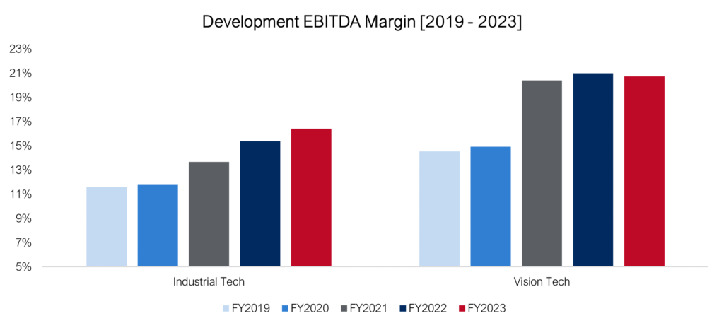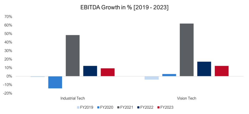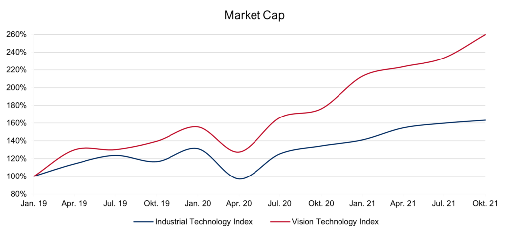 Vision tech companies even show a stronger performance compared to the rest of the Industrial Tech index (e.g., controls, integrated providers, engineering, machinery) both pre and post Covid.