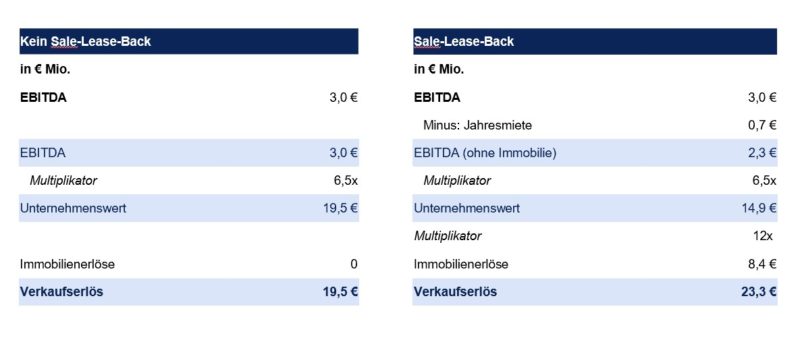 Frequently, medium-sized companies fail to realize the value of the real estate in the context of a total sale and forego significant economic benefits. As the example “No sale-leaseback-back” below clearly shows, the EBITDA multiple applied by the buyer does not value the company’s real estate at its market value.
